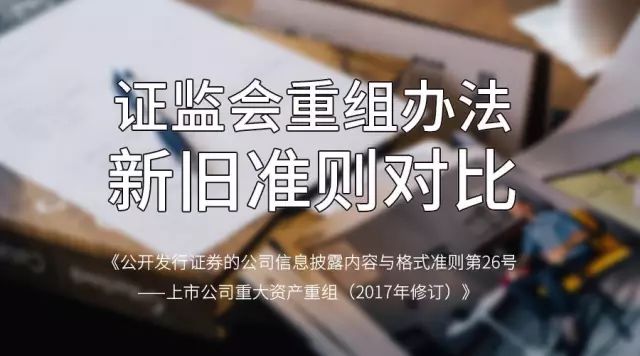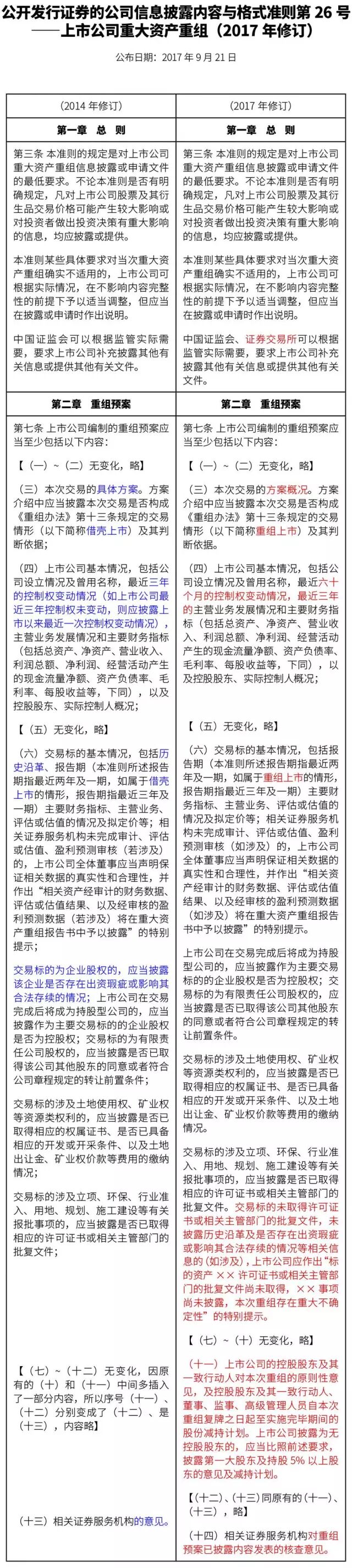 9月22日,证监会发布会宣布对《公开发行证券的公司信息披露内容与格式准则第26号——上市公司重大资产重组(2014年修订)》(证监会公告[2014]53号)进行了相应修订,进一步明确相关规则的具体执行标准,并公布修订后的2017年版本。