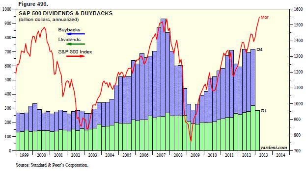 不过,光看公司用以股票回购的绝对支出也许并不恰当。正如哈佛大学的两位学者在一项近期研究中显示的那样,一方面,公司可以一边向股东支付现金,一方面又通过股权增发获得新的股权融资。假如考虑到这一因素,那么,同一时期标普500指数成分股公司向股东支付的现金总额占公司净收益的比例就下降到44%。再者,就美国上市公司的整体来看,标普500指数成分股公司向股东支付的现金显然高于平均水平——美国上市公司整体支付给股东的现金大概占净收益的33%。