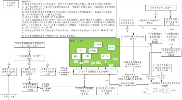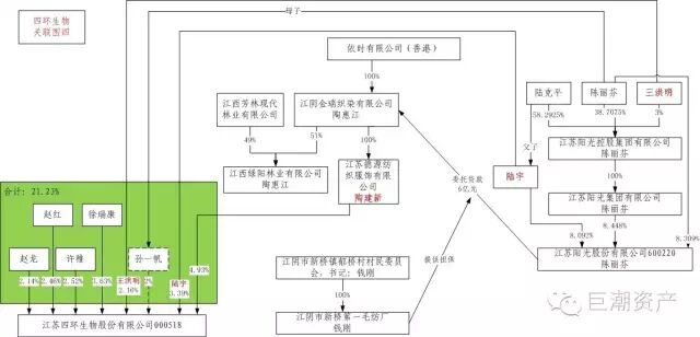 江苏德源的100%控股股东为江阴金瑞织染有限公司(简称:江阴金瑞),江阴金瑞的100%控股股东是一家注册于香港的依时有限公司(简称“依时公司”),依时公司的股东需要专业人士通过专业途径查询。江阴金瑞在2011年是江苏阳光第三大股东,2012年6月8日经济观察报文章[3]记载:本报多方核实获悉,江阴金瑞织染有限公司的公司住所就在阳光集团工业园内部。其中,江阴金瑞织染有限公司的法人代表陶惠江系阳光集团羊绒车间主任。而江苏德源现法定代表人陶建新又是江苏春辉(四环生物向其买苗木未付款,正在诉讼)、江西高峰(四环生物曾定向增发收购江西高峰100%股权,后被否)的法定代表人,在江西高峰住所地赣州市全南县政府网站上,江西高峰被表述为“江苏阳光集团投资兴建的一家股份制公司”。赣州农网上载明:江西高峰生态农林开发有限公司是由江苏阳光集团和全南县天龙林业资产管理有限责任公司组建而成的股份制公司。公司注册资金1.2亿元,其中阳光集团占65%的股权,天龙公司占35%的股权。阳光集团以现金入股,天龙公司山林作价入股。有了这些证据,我们不敢不相信“江苏德源为阳光集团实际控制”。