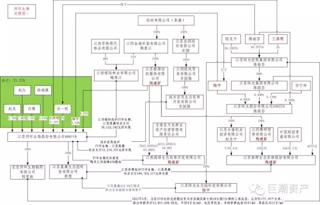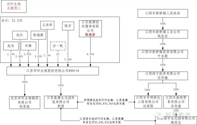 2015年3月28日,四环生物公告,江苏晨薇以2.02亿元收购江苏阳光生态园科技有限公司(简称“阳光生态园”)位于江阴市新桥镇的苗木、组培资产,该笔交易经四环生物股东大会审议批准后生效。阳光生态园的法定代表人为陆宇,实际控制人为陆克平。陆宇与阳光生态园的董事王洪明时为四环生物前十大股东。