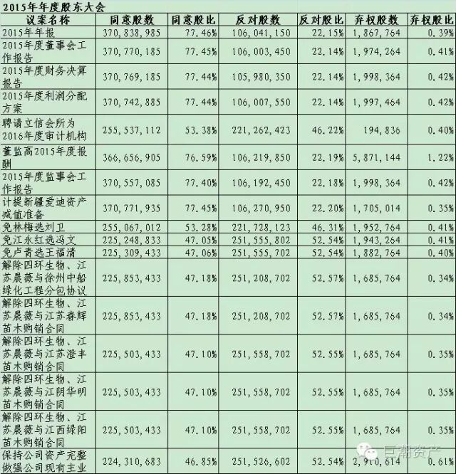 2015年5月20日的年度股东大会上,四环生物原议案以及徐瑞康提出的议案均获通过,广州盛景提出的议案均未或通过,广州盛景提名并选举为独立董事的林梅女士此次被罢免。