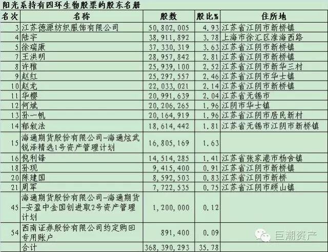 需要说明的是,阳光系股东在四环生物的持股情况处于动态变化当中,这些股东的持股处于此消彼涨的状态,这些股东绝大多数是江阴人,均是唯陆庄主马首是瞻之人,另有与陆庄主有深度合作的生意伙伴也为其助阵。